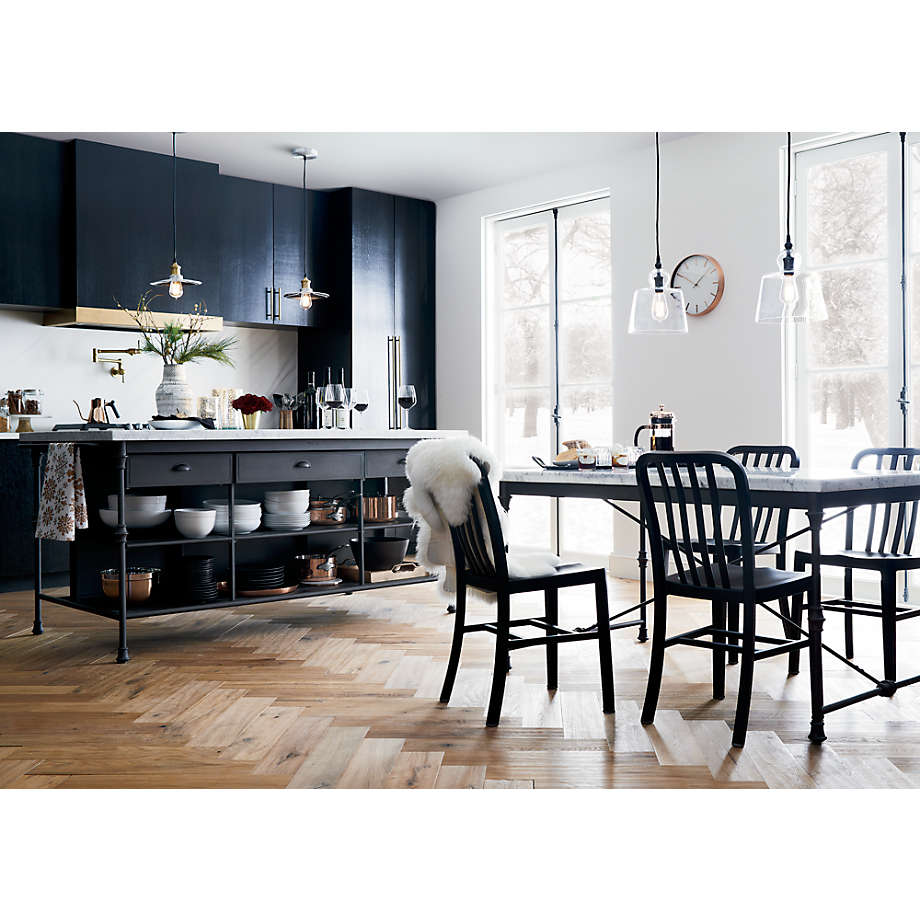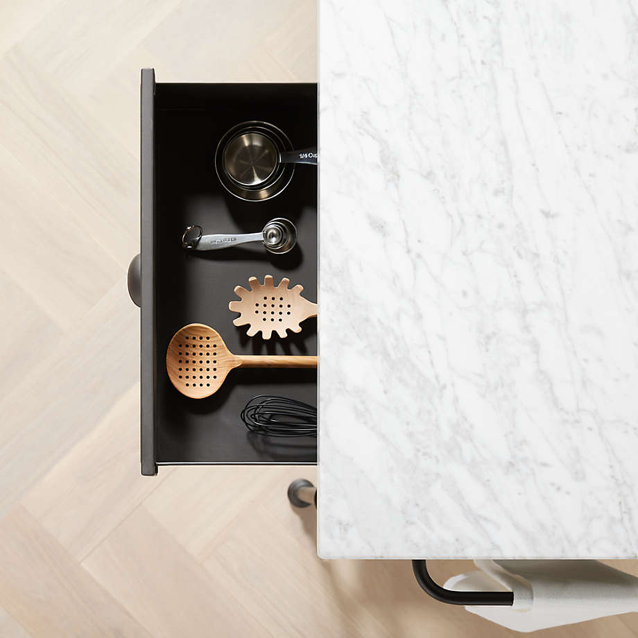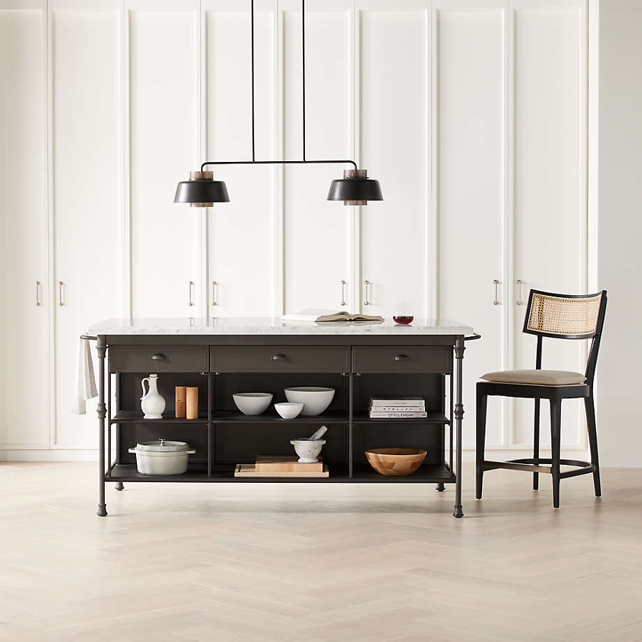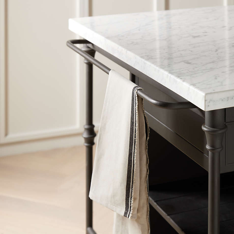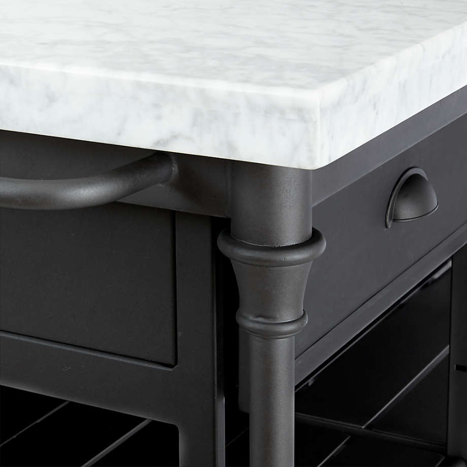 Prized for its natural grey-white veining, the top's expansive Carrara marble is perfectly matched to its classic black cast steel and aluminum base. Hand finished for a soft antique look, the frame is shaped with slender legs and ornamental details, and features three drawers, six open shelves for storage, a towel rack and space for three counter stools. Designed by Blake Tovin of Tovin Design, the French Kitchen Large Kitchen Island is a Crate and Barrel exclusive.